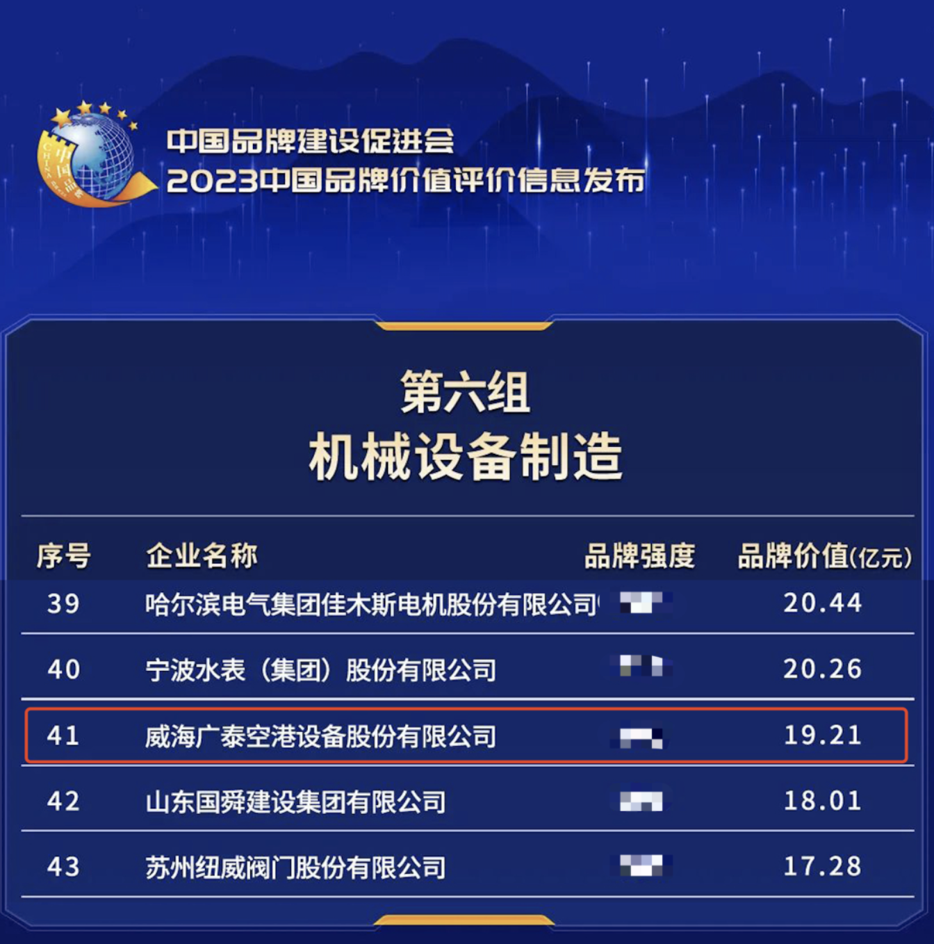 2023年5月11日,新華社、浙江省人民政府、中國品牌建設(shè)促進(jìn)會(huì)、中國資產(chǎn)評(píng)估協(xié)會(huì)等單位在浙江德清聯(lián)合發(fā)布“2023中國品牌價(jià)值評(píng)價(jià)信息”。威海廣泰空港設(shè)備股份有限公司(簡(jiǎn)稱“威海廣泰”)在此次發(fā)布評(píng)價(jià)機(jī)械設(shè)備制造組中,品牌價(jià)值獲評(píng)為19.21億元?!爸袊放苾r(jià)值評(píng)價(jià)信息發(fā)布”…
