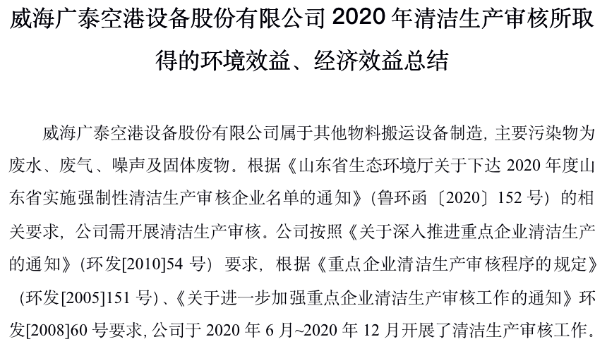 威海廣泰空港設(shè)備股份有限公司2020年清潔生產(chǎn)審核所取得的環(huán)境效益、經(jīng)濟(jì)效益總結(jié)威海廣泰空港設(shè)備股份有限公司屬于其他物料搬運(yùn)設(shè)備制造,主要污染物為廢水、廢氣、噪聲及固體廢物。根據(jù)《山東省生態(tài)環(huán)境廳關(guān)于下達(dá)2020年度山東省實(shí)施強(qiáng)制性清潔生產(chǎn)審核企業(yè)名單的通知》(魯環(huán)函〔…