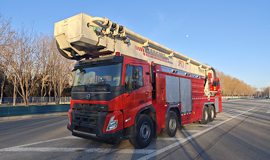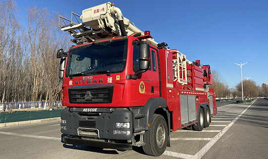 舉高噴射消防車裝備有水泵、泡沫一水兩用炮和泡沫液罐,滅火能力強,作業(yè)范圍大,操作方便,作業(yè)安全保護裝置齊全,行駛機動靈活。